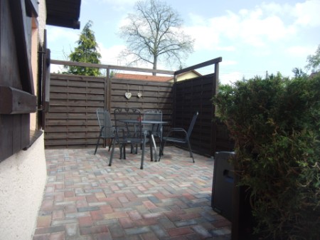 Ein PKW-Stellplatz und eine Terasse gehören zum Ferienhaus. Bei Bedarf ist auch ein Grill vorhanden.